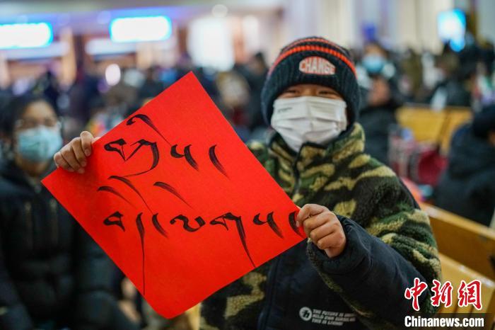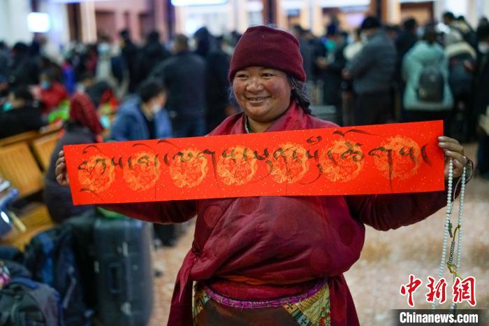 圖為春運(yùn)首日,拉薩火車站一旅客獲得車站送的藏式春聯(lián),上面書寫的是藏語“扎西德勒 吉祥如意”?!〗w波 攝