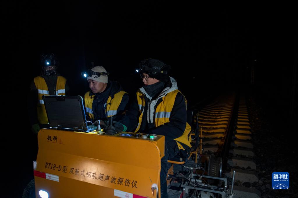 羅布(左)和同事在進(jìn)行鋼軌探傷作業(yè)(1月12日攝)。新華社記者 孫非 攝