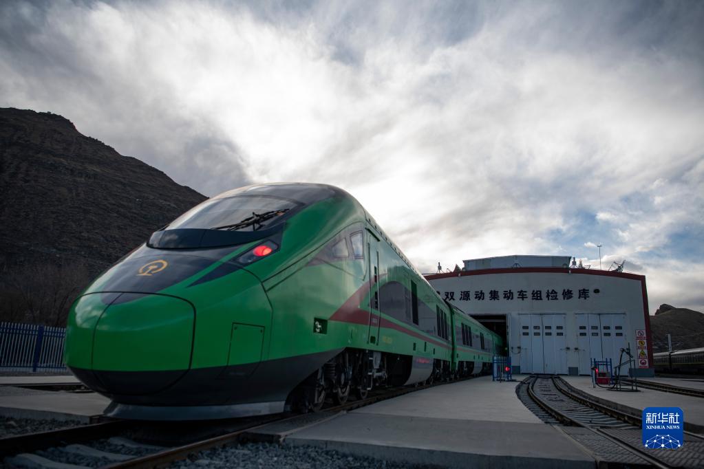 在拉薩機(jī)輛整備中心,動車組在檢修庫進(jìn)行整備作業(yè)(1月10日攝)。新華社記者 孫非 攝