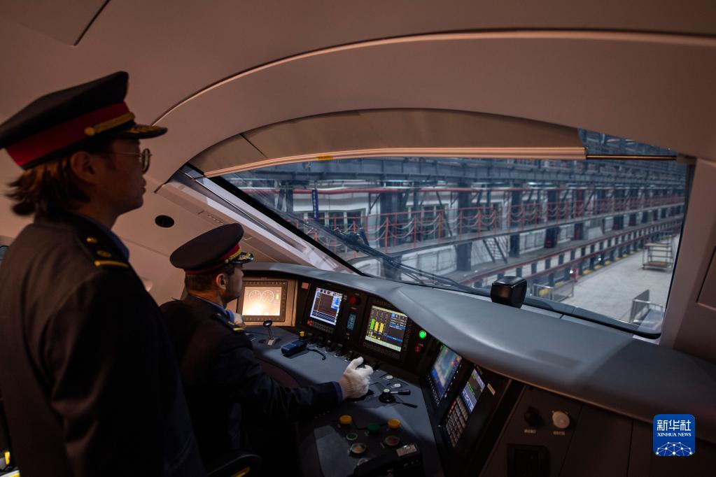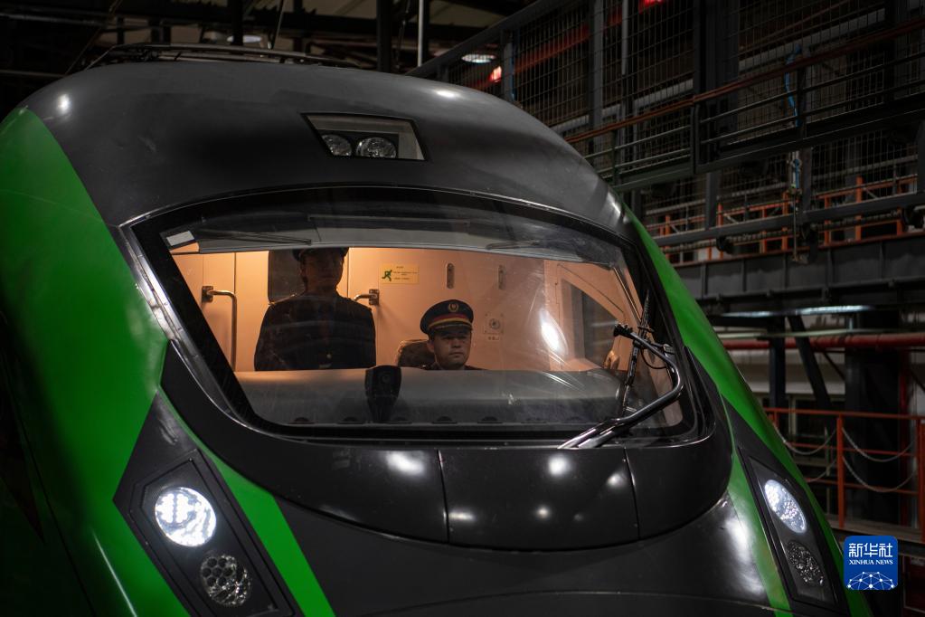 在拉薩機(jī)輛整備中心,黃起崗將動車組駛?cè)胪\囄恢茫?月11日攝)。新華社記者 孫非 攝