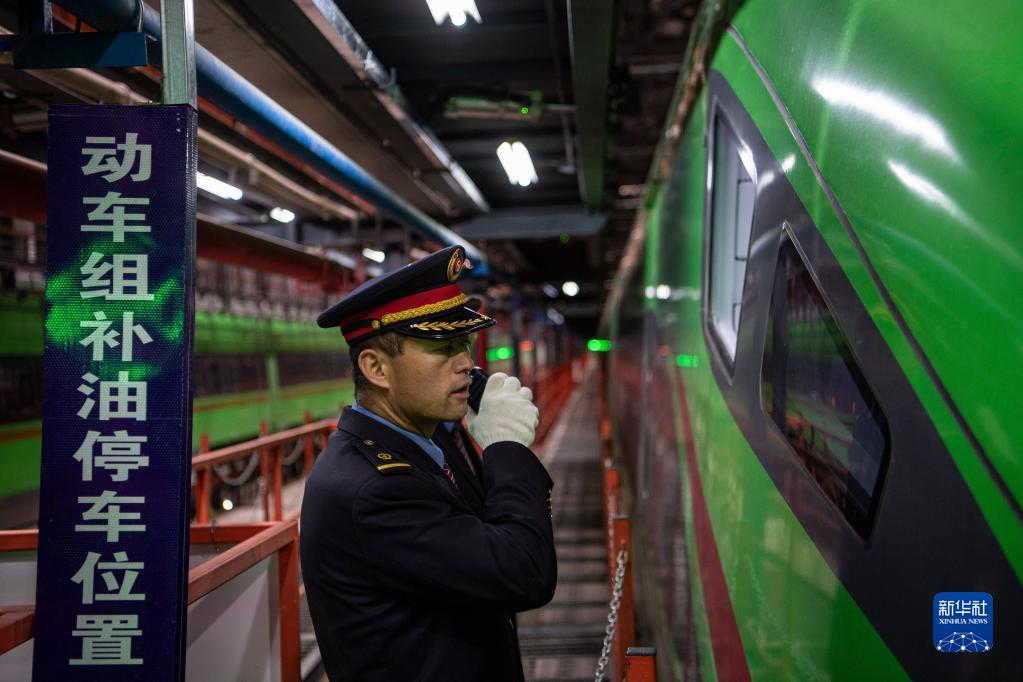 在拉薩機(jī)輛整備中心,黃起崗在和一體化調(diào)度中心確認(rèn)動車組補(bǔ)油位置(1月11日攝)。新華社記者 孫非 攝