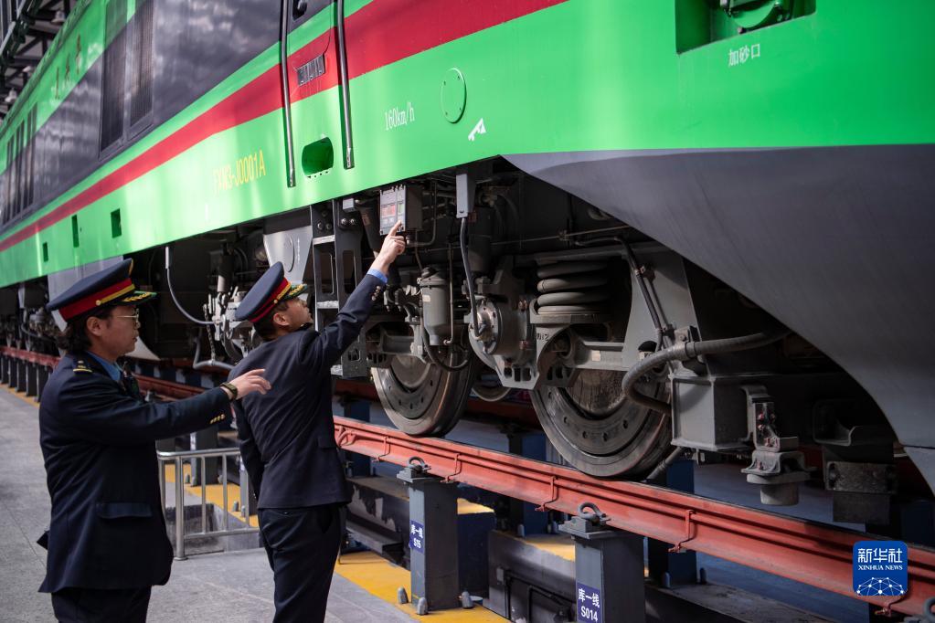 在拉薩機(jī)輛整備中心,黃起崗(右)和同事對動車組進(jìn)行走行部檢查(1月11日攝)。新華社記者 孫非 攝