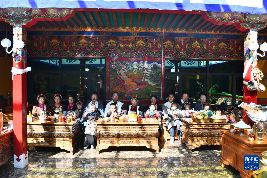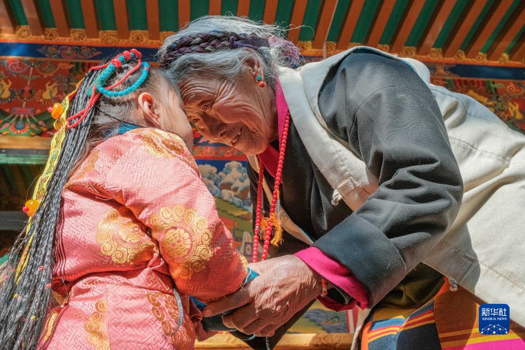 在位于西藏日喀則拉孜縣扎西宗鄉(xiāng)雜村的家中,次旦老人一臉幸福的微笑,家中小輩正輪流上前和她行碰頭禮。