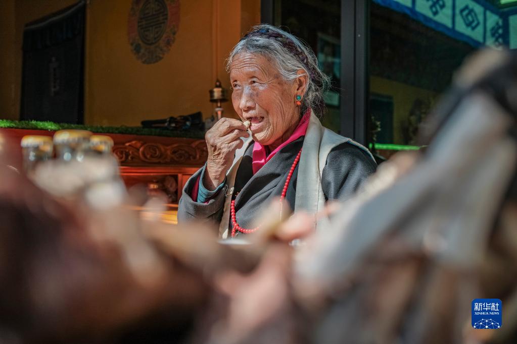 次旦老人在吃糌粑(1月22日攝)。新華社記者 孫非 攝
