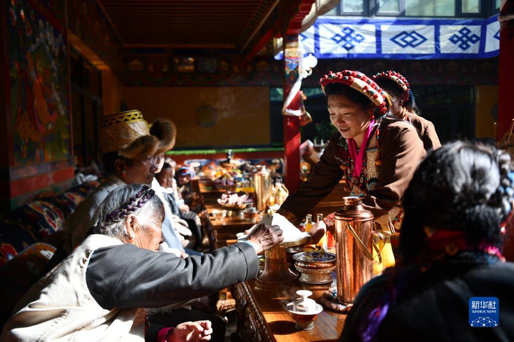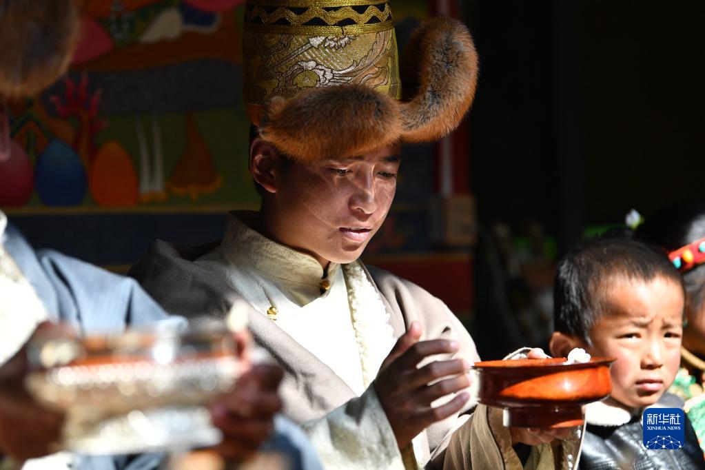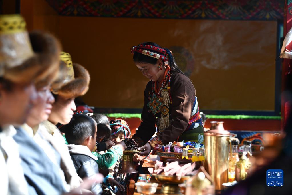 次旦老人接過孫女敬獻(xiàn)的切瑪(1月22日攝)。新華社記者 晉美多吉 攝