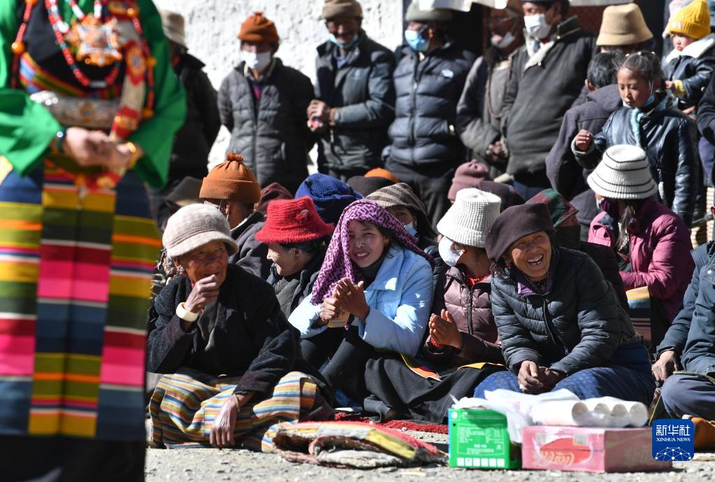 西藏日喀則市芒普鄉(xiāng)普村村民觀看文藝演出隊表演(1月21日攝)。新華社記者 晉美多吉 攝
