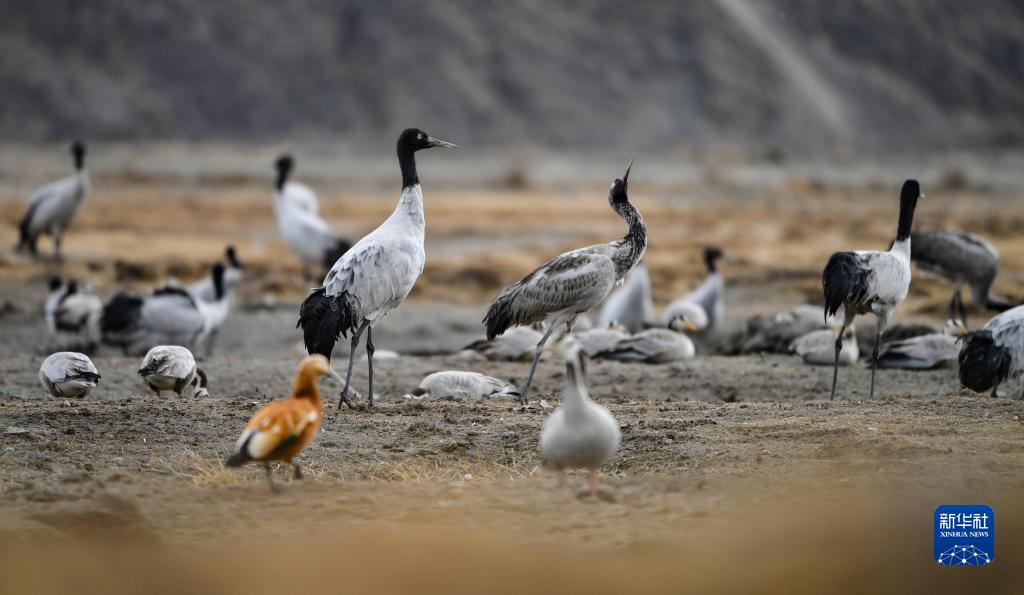 在西藏雅魯藏布江中游河谷黑頸鶴國(guó)家級(jí)自然保護(hù)區(qū)日喀則片區(qū)拉孜縣附近,大量越冬的黑頸鶴翩翩起舞,迎接春天的到來(lái)。