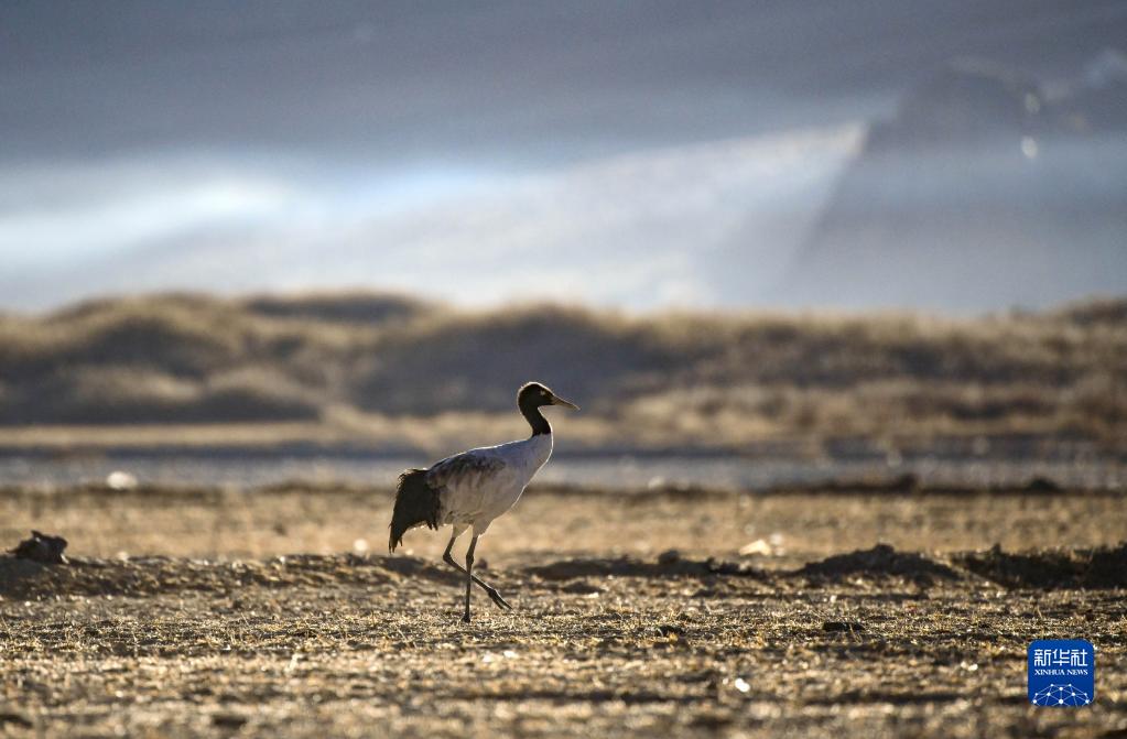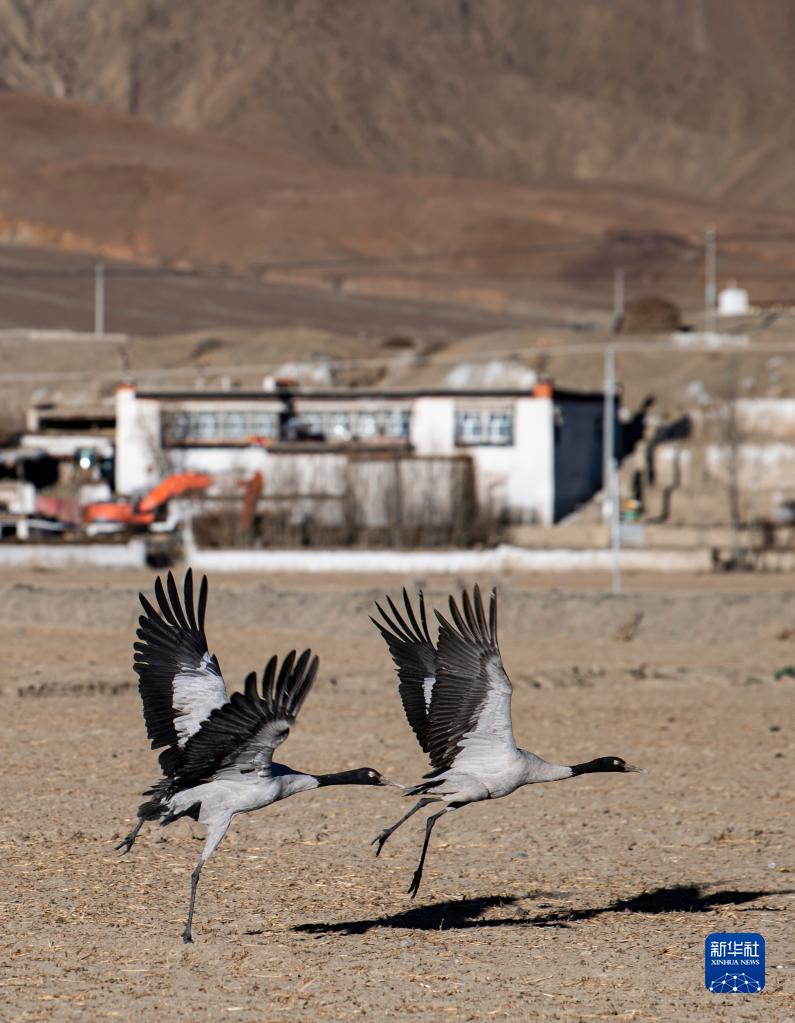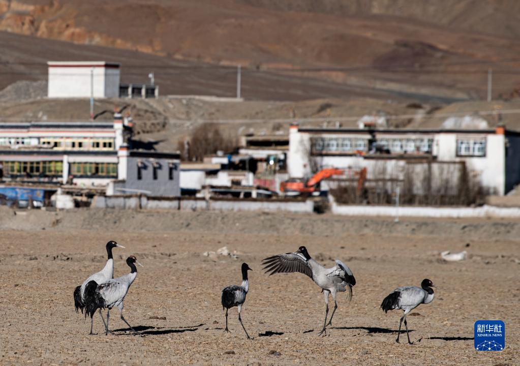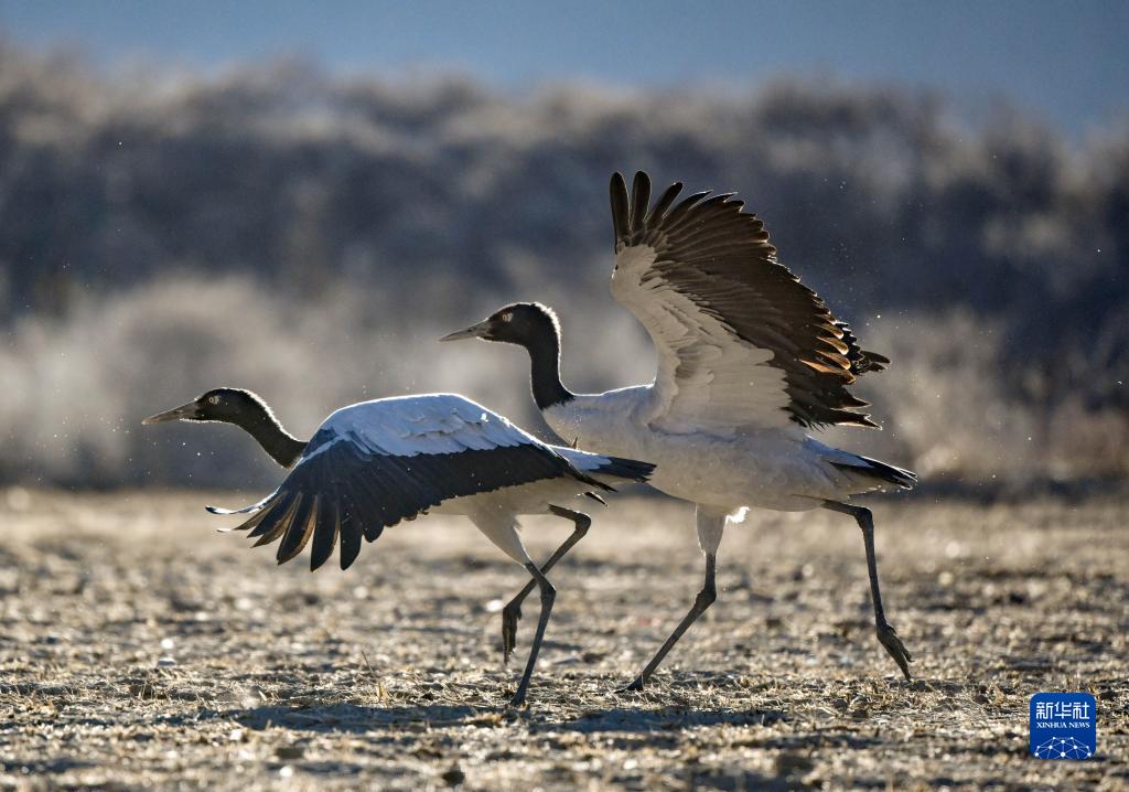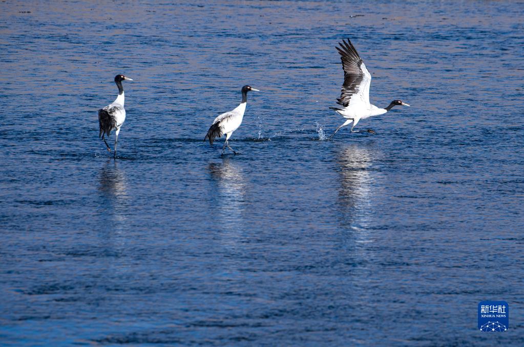 在西藏雅魯藏布江中游河谷黑頸鶴國(guó)家級(jí)自然保護(hù)區(qū)日喀則市拉孜縣越冬的黑頸鶴(1月23日攝)。新華社記者 孫非 攝