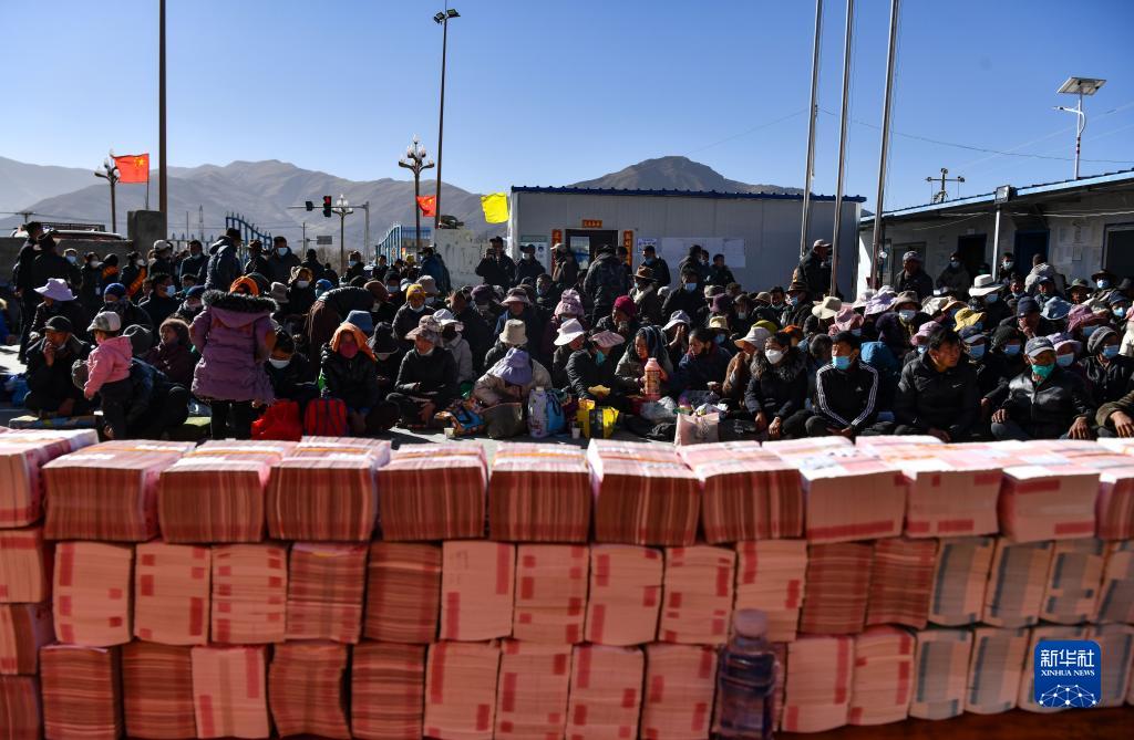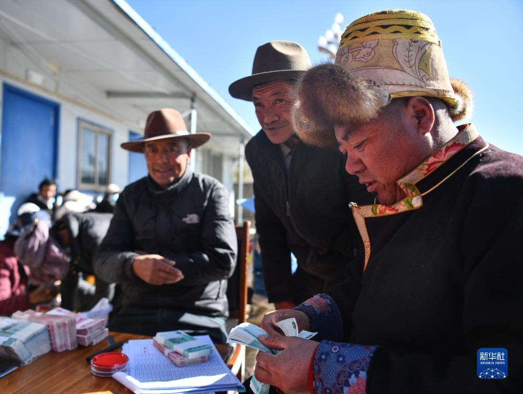 滴新村村民在現(xiàn)場(chǎng)領(lǐng)取分紅現(xiàn)金(2月2日攝)。新華社記者 晉美多吉 攝