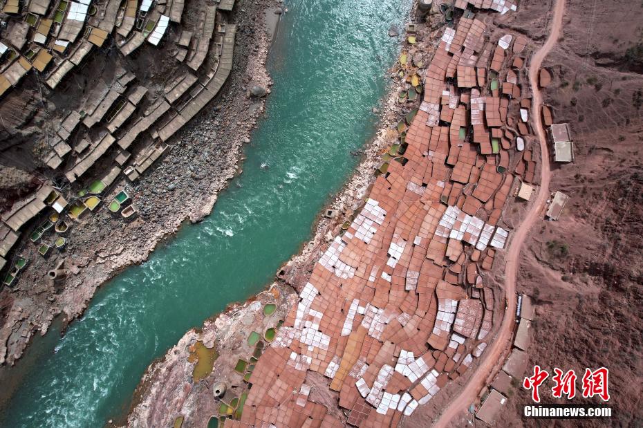 在西藏昌都芒康縣納西民族鄉(xiāng)瀾滄江兩側(cè),有一處古老的、大大小小數(shù)千塊鹽田。史料記載,當?shù)貢覃}歷史距今已有1000多年。木柱搭建的鹽田,高低錯落,依河谷山勢,在臨江兩岸蔓延。當?shù)孛癖姀慕系柠}井、鹽池中抽出鹵水,引入鹽田,經(jīng)過陽光與風的杰作,結(jié)晶成鹽。進入鹽田,房內(nèi)頂部到處懸掛鐘乳狀晶鹽,仿若“水晶宮”的世界。圖為2月13日,西藏昌都芒康千年古鹽田。(無人機照片)
