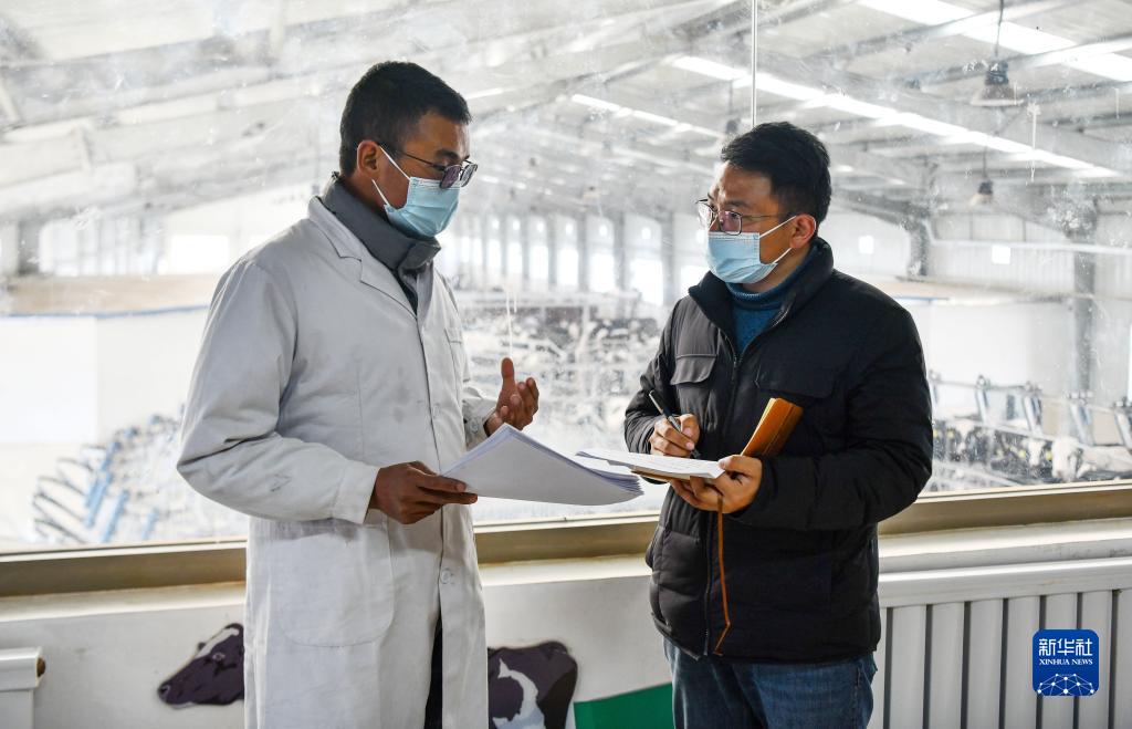 扎西江村(右)在隆子縣一家標(biāo)準(zhǔn)化奶牛養(yǎng)殖基地調(diào)研當(dāng)?shù)禺a(chǎn)業(yè)發(fā)展和帶動(dòng)群眾增收情況(2月14日攝)。新華社記者 晉美多吉 攝