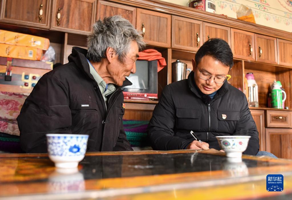 扎西江村(右)在慰問老黨員索朗,了解搬遷群眾生活情況(2月15日攝)。新華社記者 晉美多吉 攝