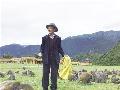 在多布杰看來(lái),猴群也是一個(gè)小社會(huì),母子情深、朋友互助、爭(zhēng)斗打架都有。在上千只猴子中,多布杰只給一只臉特別紅的小猴子取了個(gè)名字——“瑪惹”,漢語(yǔ)意思是“小紅”。因?yàn)槌錾蠛飲寢寷](méi)有奶水,它餓得嗷嗷直叫,多布杰只得將它帶回家中照料。那時(shí),他的孫女也特別喜歡這只小猴子,每天放學(xué)回家就會(huì)給它喂吃的。幾天后,孫女翻遍了每個(gè)角落都沒(méi)有找到“瑪惹”,急得嚎啕大哭。多布杰耐心地說(shuō),我們和“瑪惹”是好朋友,帶它回來(lái)是為了讓它活下去,但它終歸是要回到猴群中,回到猴媽媽身邊?!艾斎恰遍L(zhǎng)大后,也時(shí)常會(huì)找多布杰蹭衣撒嬌。
