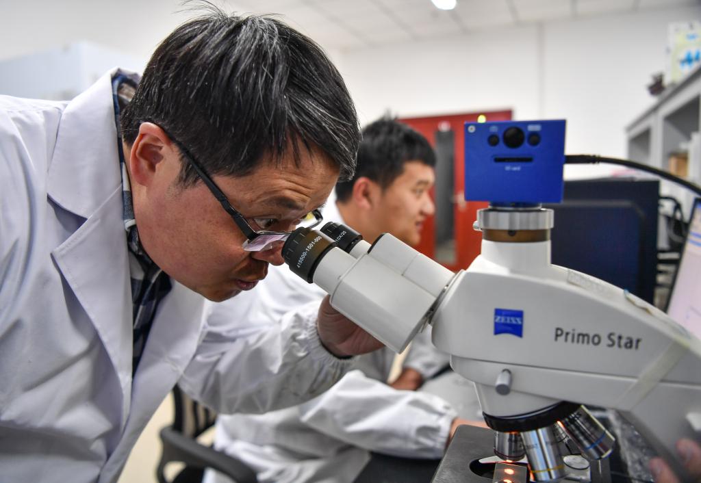 在西藏高原生物研究所,楊樂(lè)在實(shí)驗(yàn)室中觀察動(dòng)物標(biāo)本(3月2日攝)。新華社記者 晉美多吉 攝