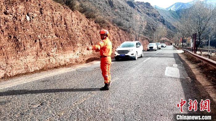 圖為昌都市卡若區(qū)森林消防中隊“火焰藍”志愿服務(wù)隊指揮過往車輛安全通行。 卡若區(qū)森林消防中隊“火焰藍”志愿服務(wù)隊供圖