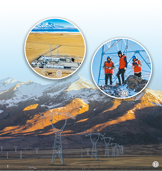 圖①:位于海拔4700多米的阿里聯(lián)網(wǎng)工程霍爾變電站。圖②:國(guó)網(wǎng)阿里公司工作人員正在巡檢線(xiàn)路。圖③:阿里地區(qū)的曠野上,電力鐵塔在夕陽(yáng)下熠熠生輝。(本文照片均為記者徐馭堯攝)