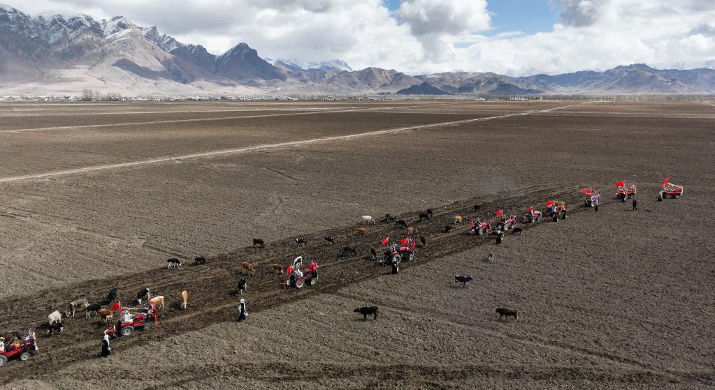 西藏林周縣強(qiáng)嘎村的春耕儀式(無(wú)人機(jī)照片)(3月16日攝)。新華社記者 晉美多吉 攝