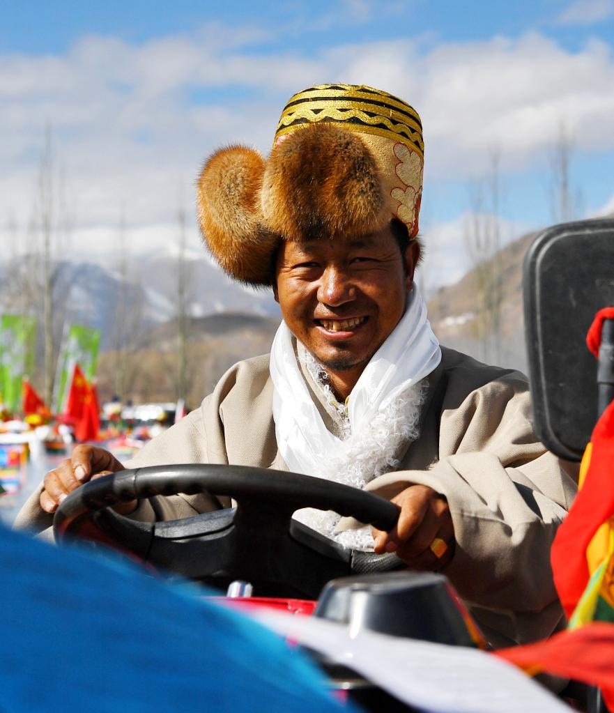 西藏林周縣強(qiáng)嘎村的春耕儀式上駕駛農(nóng)機(jī)的村民(3月16日攝)。新華社記者 張汝鋒 攝