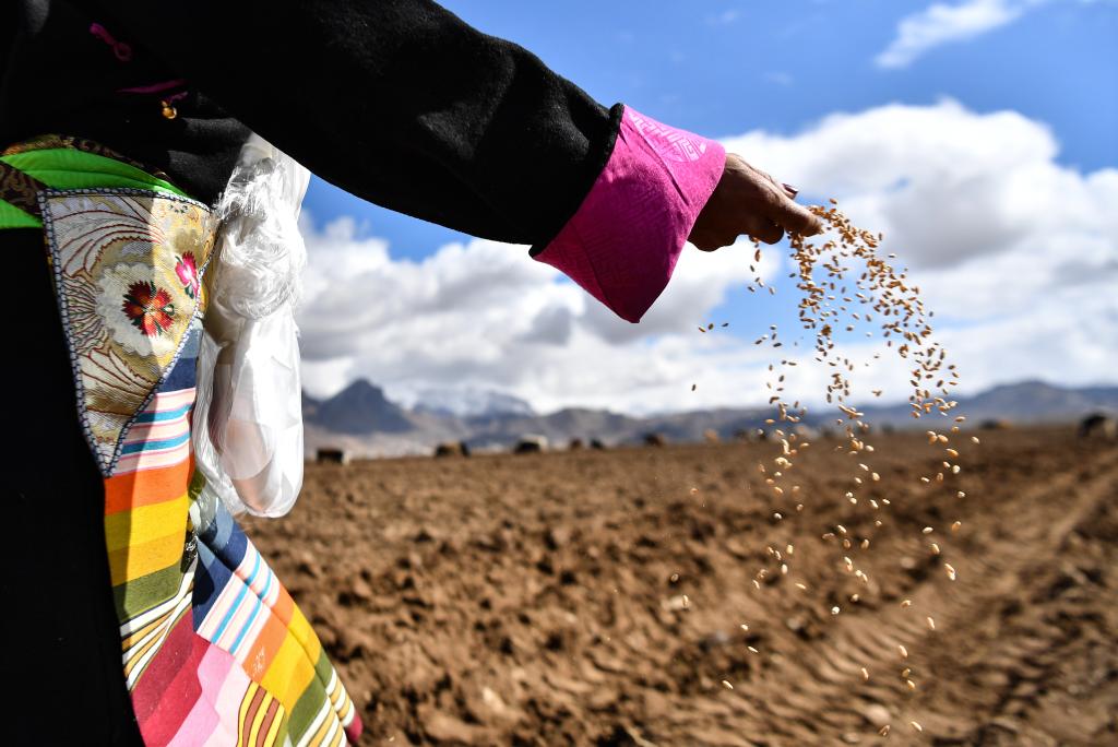 一名年輕男子使用“二牛抬杠”犁耕法,驅(qū)使著牲畜率先在農(nóng)田上劃出新年的第一犁,其余村民駕駛著拖拉機(jī)緊跟其后。锃亮的鐵犁在農(nóng)田上翻出一條條小溝,跟隨的藏族姑娘揮手拋灑,一粒粒青稞種子落在泥土中。