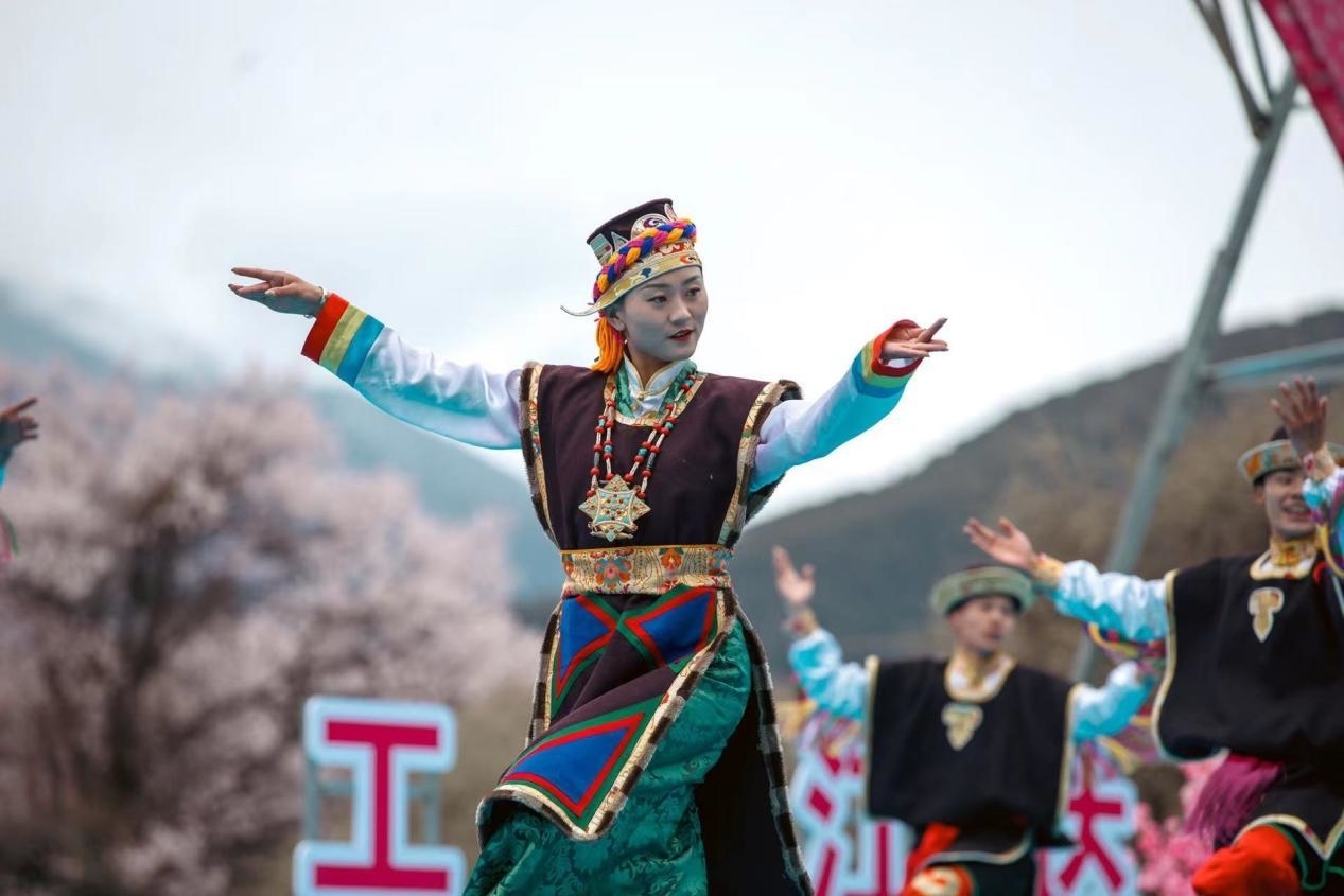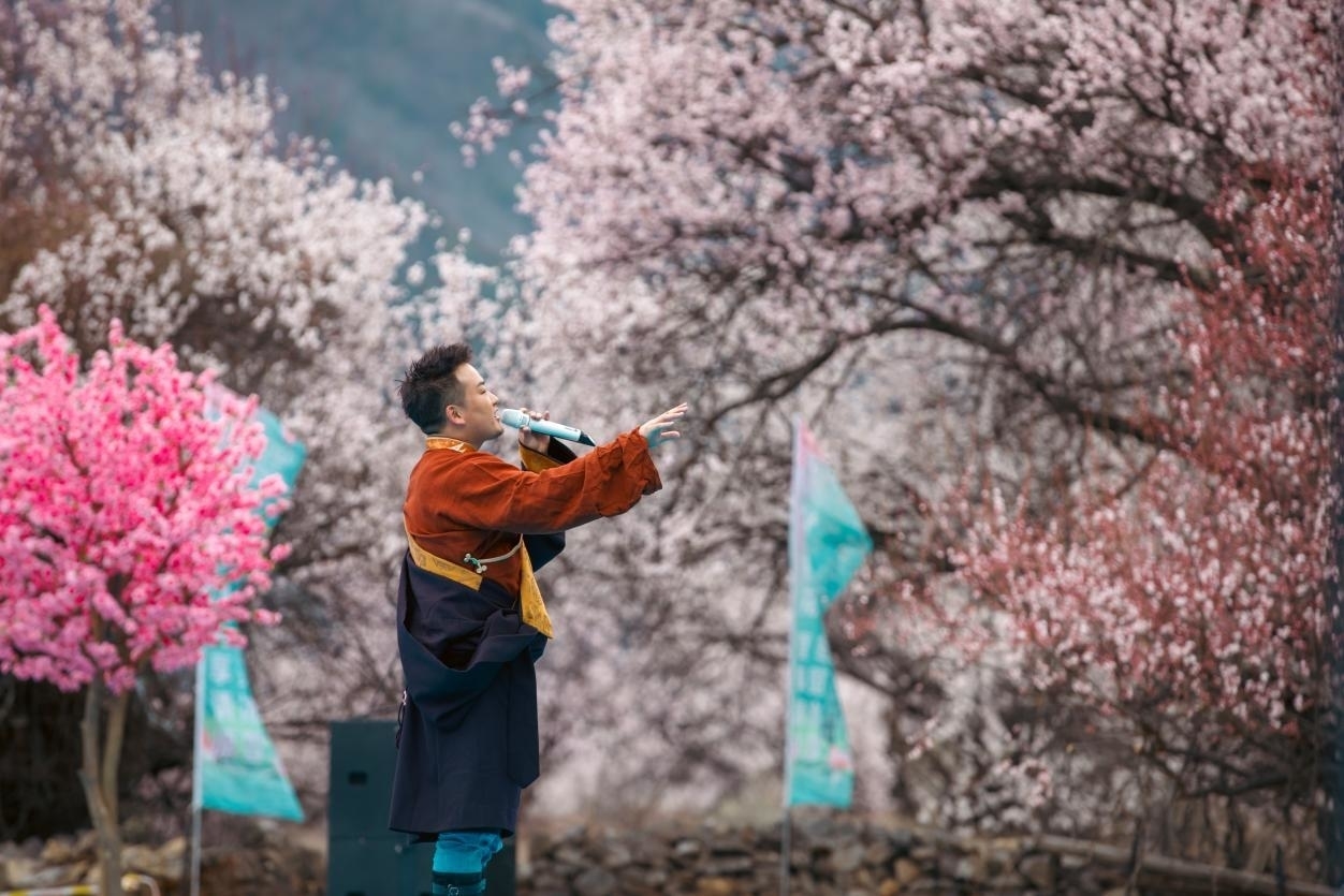 皚皚雪山下,千年古堡旁,灼灼桃花,花開正艷。羅布桑珠、巴金旺甲、齊旦布、桑杰才讓等藏族知名歌手、工布江達本地歌手、當?shù)厝罕婟R聚,流行歌曲與工布民歌等當?shù)靥厣硌萁Y(jié)合,為網(wǎng)友們獻上了一場桃花樹下的歌舞盛宴。