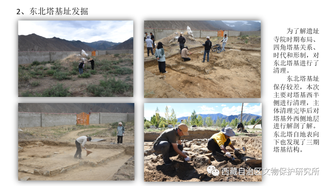 2022年,溫江多考古隊對遺址西南塔北側(cè)塔基、東北塔基址進(jìn)行了清理發(fā)掘,對遺址中區(qū)西部地層進(jìn)行了解,對遺址南部五峰山部分區(qū)域進(jìn)行了調(diào)查。發(fā)掘面積520平方米,出土磚、瓦、陶、石、骨、鐵等各類遺物標(biāo)本100件。西南角和東北角兩座佛塔均發(fā)現(xiàn)了上下疊壓的早、中、晚三期塔基,兩座塔基的平面形制和規(guī)格基本一致,均為平面呈多折角“亞“字形,土石結(jié)構(gòu)塔基,邊長均長約18米。遺址中區(qū)西部T0905探方內(nèi)清理出墻址2處,臺基1處。兩道墻址一為南北向夯土墻,一為東西向石墻,均位于④層下,與晚期塔基為同一時期。臺基1位于⑥層下,北部為一道東西向石砌臺基,內(nèi)部(南)為五花墊土層,與早期佛塔為同時期。調(diào)查工作在五峰山頂發(fā)現(xiàn)修行洞、修行點、小型塔基等共8處,在山北麓發(fā)現(xiàn)依山修建的具有一定規(guī)模的房居址、大型佛塔基址等共5處。