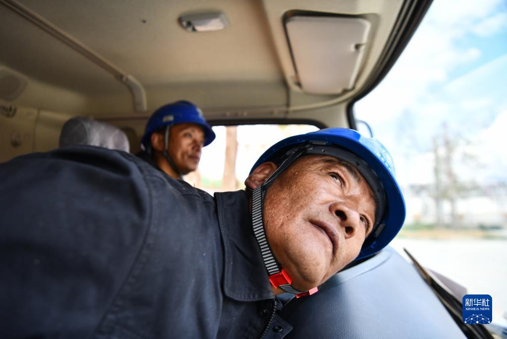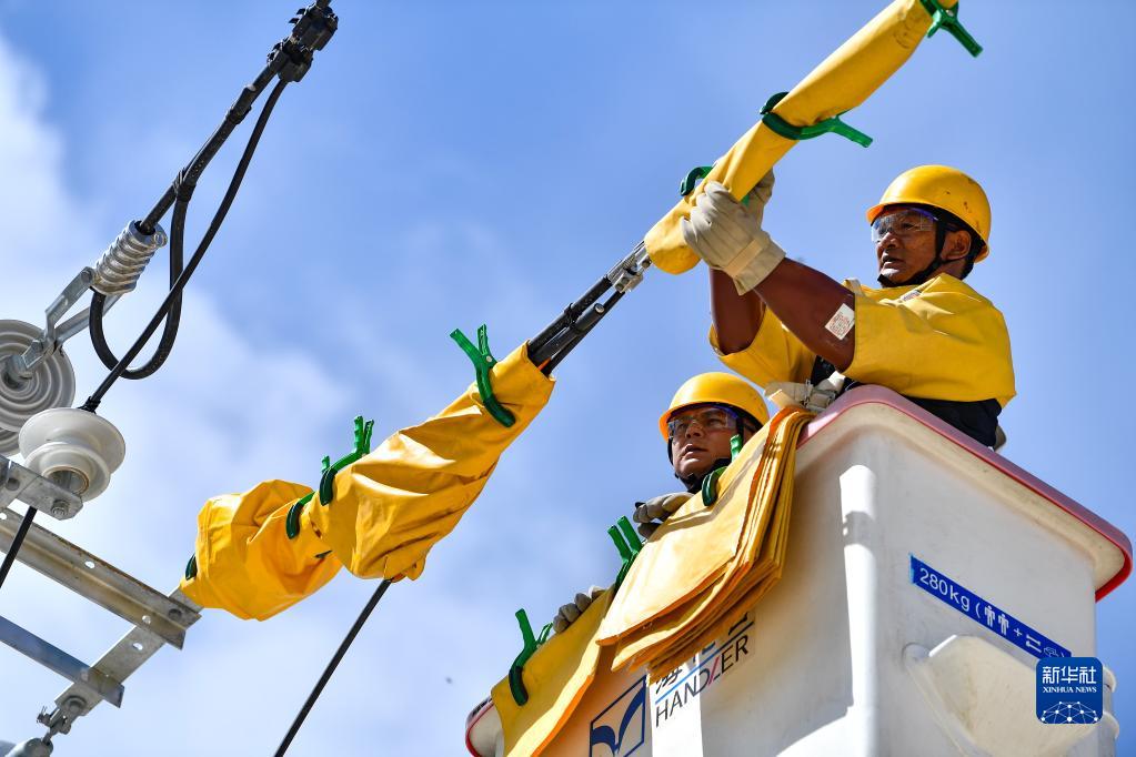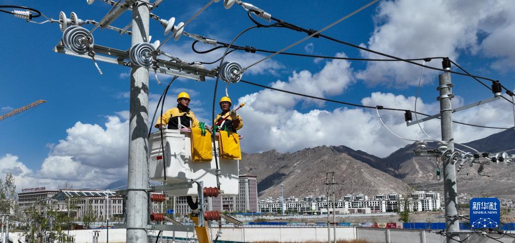 4月26日,扎西尼瑪(右)和徒弟在進行高空帶電作業(yè)演練。新華社記者 晉美多吉 攝