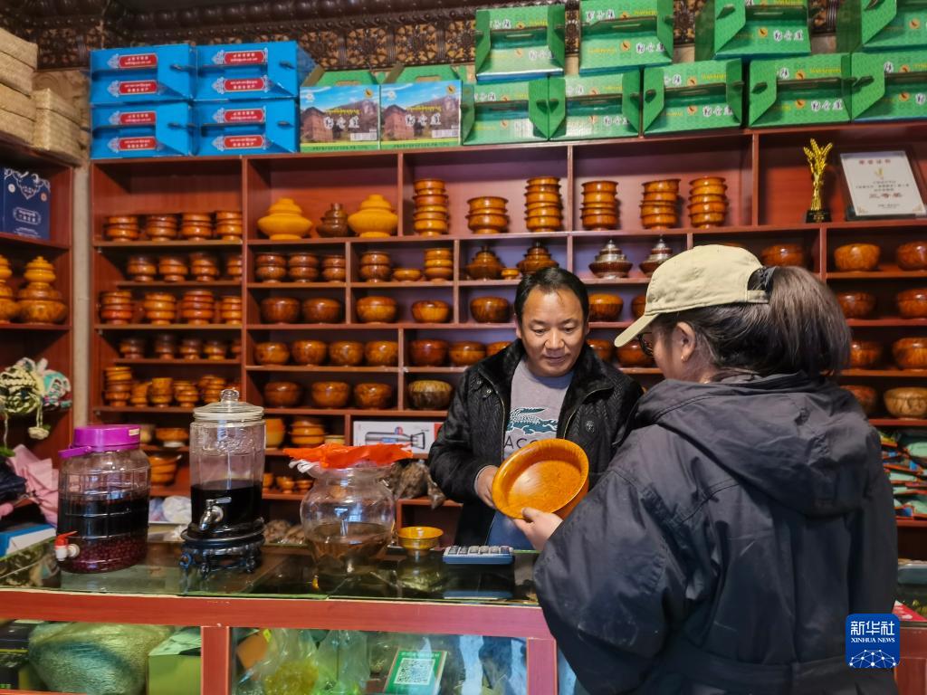 4月24日,游客在山南錯(cuò)那市麻麻鄉(xiāng)次仁家的民宿中購(gòu)買(mǎi)木碗。新華社記者 劉洪明 攝