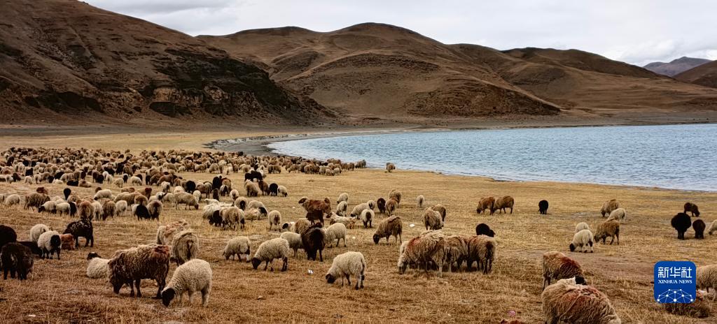 羊卓雍錯湖邊的羊群(5月1日攝,手機照片)。新華社記者 沈虹冰 攝