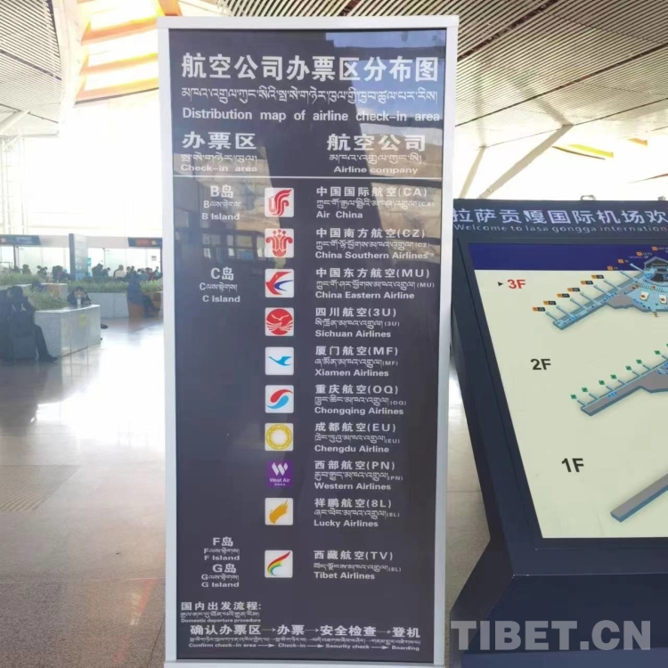 無托運(yùn)行李的旅客持個(gè)人身份證(或有效證件)前往自助值機(jī)區(qū)打印登機(jī)牌。有托運(yùn)行李和中轉(zhuǎn)聯(lián)程航班的旅客前往人工柜臺辦理。其中,乘坐西藏航空公司航班的旅客進(jìn)入出發(fā)大廳后左轉(zhuǎn)前往F、G島辦理乘機(jī)手續(xù),其他航空公司的旅客請前往B、C、D島辦理乘機(jī)手續(xù)。