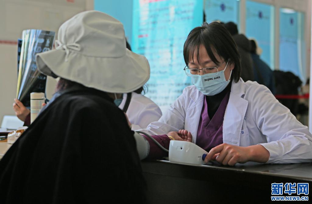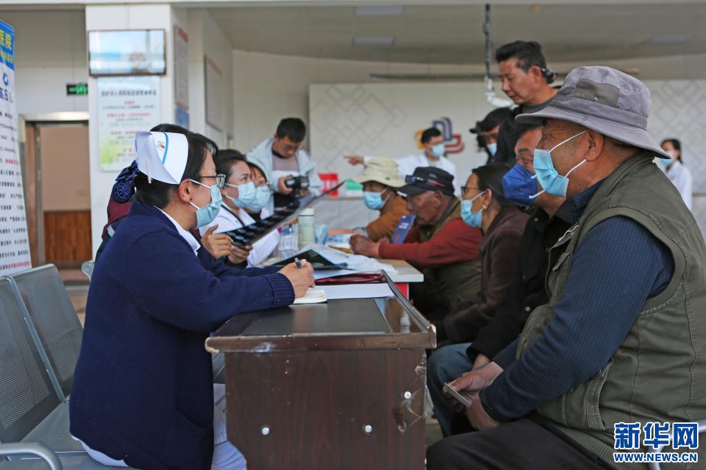 圖為“京藏?cái)y手,護(hù)佑藍(lán)唇”義診活動現(xiàn)場,醫(yī)生在為患者測量血壓。(5月5日攝)