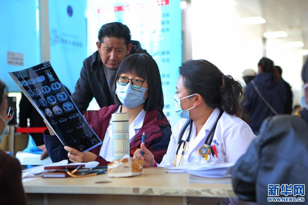 圖為“京藏?cái)y手,護(hù)佑藍(lán)唇”義診活動現(xiàn)場,楊蘇喬醫(yī)生(左一)在為患者診治疾病。(5月5日攝)
