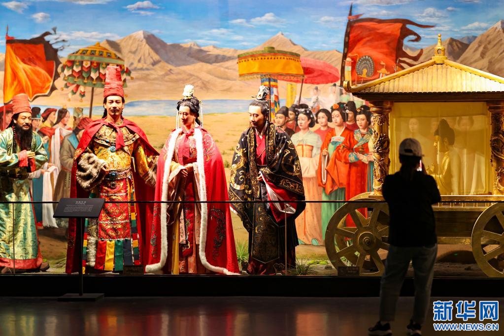 游客在西藏博物館參觀文成公主進(jìn)藏場(chǎng)景展示(5月17日攝)。新華社記者 姜帆 攝