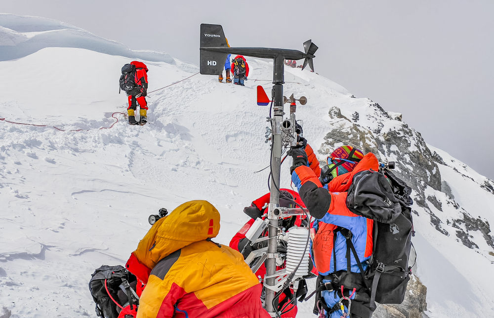當(dāng)日凌晨3時,科考隊員從海拔8300米的突擊營地出發(fā),歷經(jīng)數(shù)小時攀登,終于抵達(dá)海拔8830米的世界最高自動氣象觀測站。固定鋼筋繩索,更換蓄電池,安裝風(fēng)速風(fēng)向傳感器……經(jīng)過約1小時的緊張工作,氣象站零部件升級工作全部完成。隨后,他們攀登至8848.86米的峰頂,利用工具成功采集雪冰樣品。