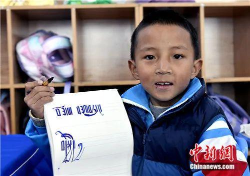 2023年3月,西藏拉薩市第一小學一年級六班學生吉美旺堆展示自己書寫的藏文。李林 攝