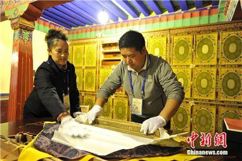 2012年9月,布達拉宮管理處文物保護科科長卓嘎(左)與布達拉宮文物保護人員洛桑共同打開貝葉經(jīng)。李林 攝