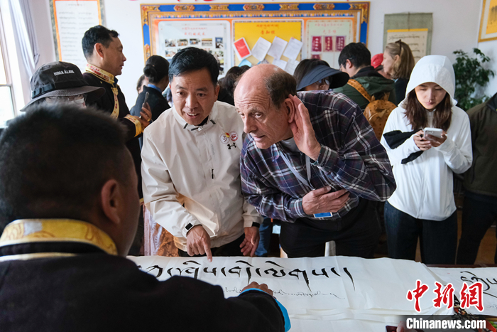 圖為5月18日上午,參訪團(tuán)成員柯馬凱(Michael Crook)側(cè)耳傾聽藏文書法老師的講解。中新社記者 江飛波 攝