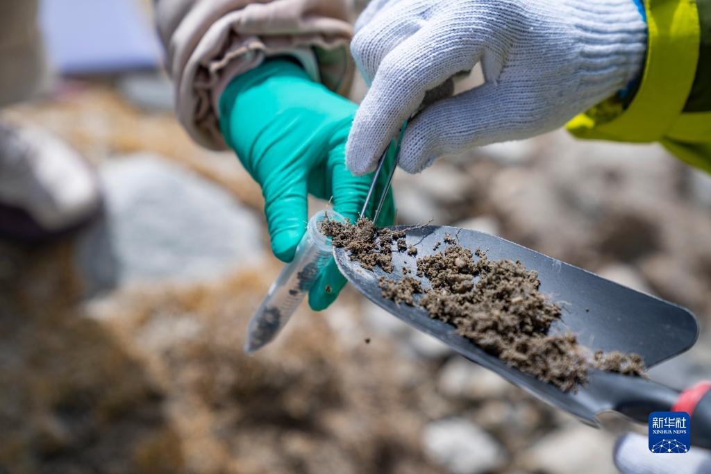 在珠峰登山大本營(yíng)附近,來(lái)自西藏大學(xué)生態(tài)環(huán)境學(xué)院的科考隊(duì)員在收集土壤樣本(5月22日攝)。新華社記者 孫非 攝