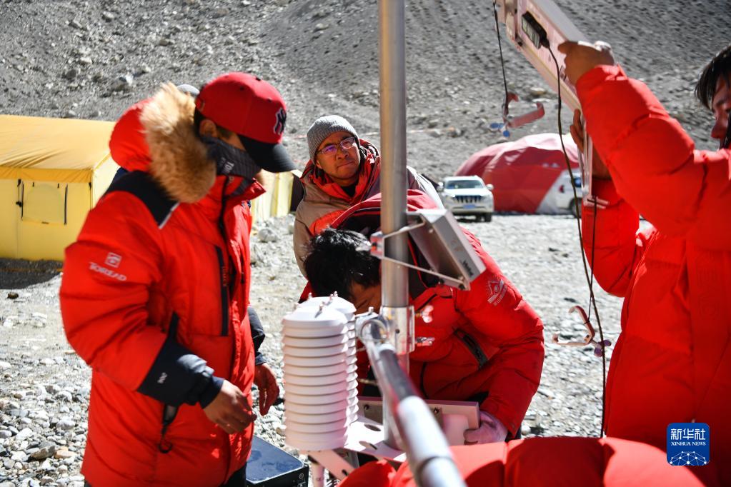 在珠峰登山大本營(yíng)附近,第二次青藏科考高海拔氣象梯度觀測(cè)小組負(fù)責(zé)人趙華標(biāo)(中)在指導(dǎo)科考登頂隊(duì)隊(duì)員架設(shè)自動(dòng)氣象站(5月9日攝)。新華社記者 晉美多吉 攝