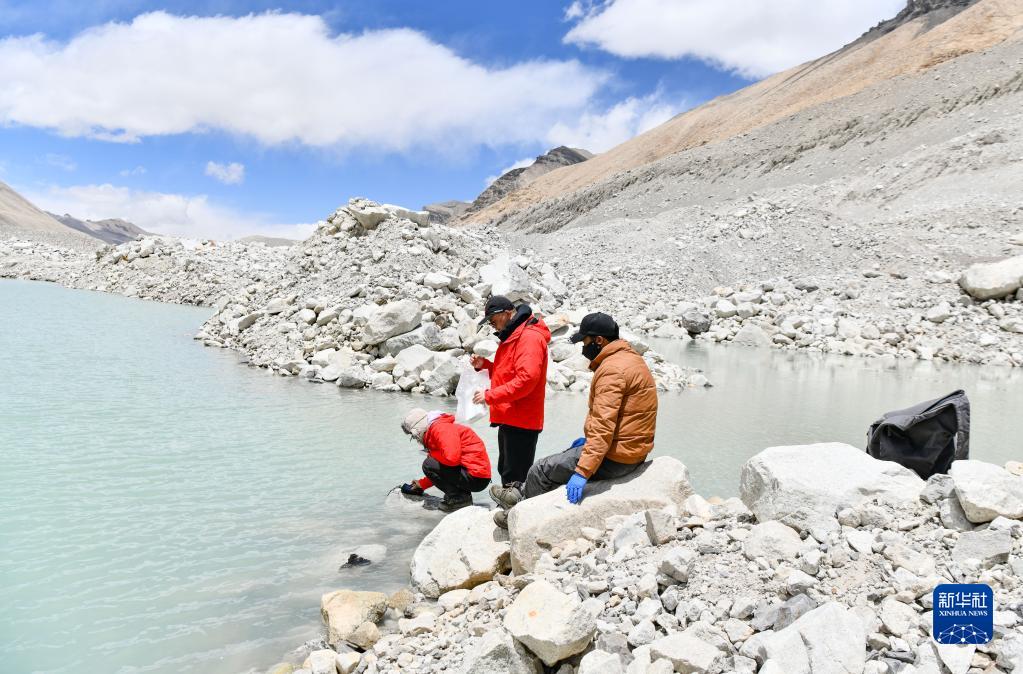 在珠峰登山大本營(yíng)附近,來(lái)自西藏大學(xué)生態(tài)環(huán)境學(xué)院的科考隊(duì)員在收集水生生物樣本(5月22日攝)。新華社記者 孫非 攝