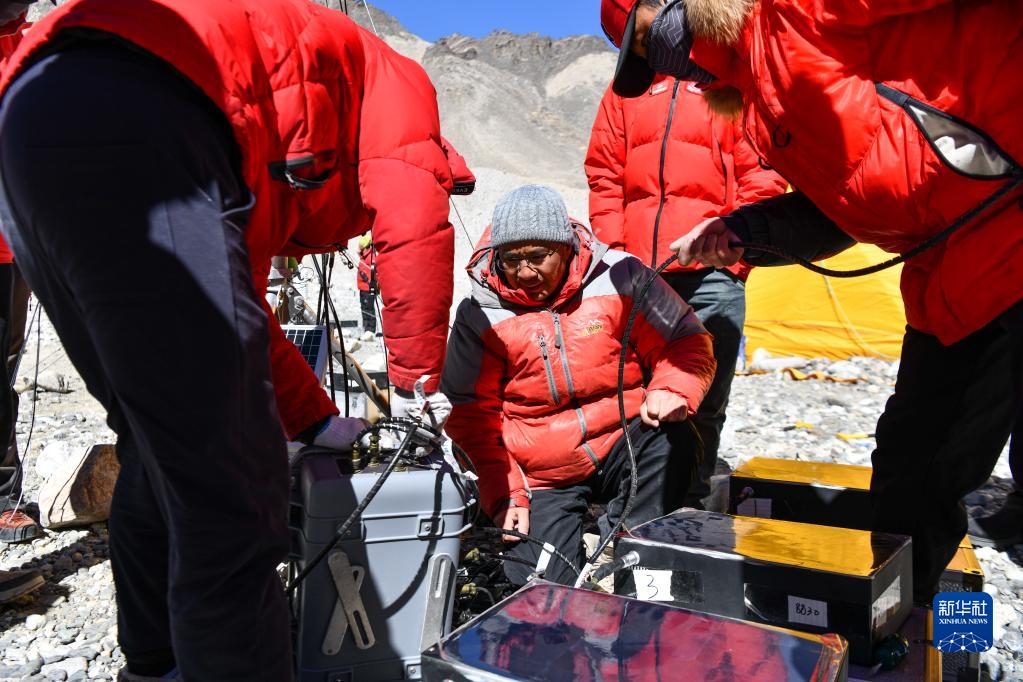 在珠峰海拔約5300米處,來(lái)自中國(guó)科學(xué)院青藏高原研究所的科考隊(duì)員在用水質(zhì)儀檢測(cè)冰前湖水質(zhì)(5月12日攝)。新華社記者 晉美多吉 攝