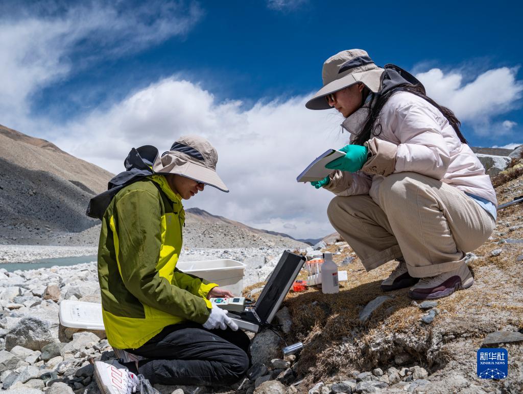 在珠峰登山大本營(yíng)附近,來(lái)自西藏大學(xué)生態(tài)環(huán)境學(xué)院的科考隊(duì)員在測(cè)量土壤溫度(5月22日攝)。新華社記者 孫非 攝
