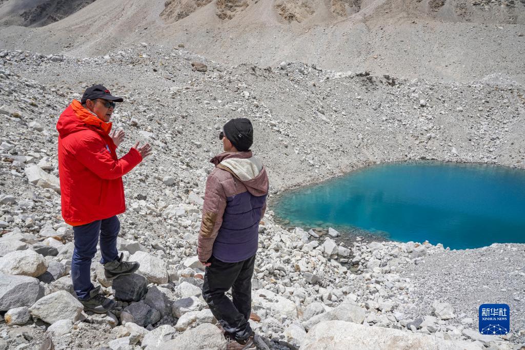 在珠峰海拔約5300米處,中國(guó)科學(xué)院西北生態(tài)環(huán)境資源研究院副院長(zhǎng)康世昌(左)和科考隊(duì)員討論冰面湖的形成原因(5月14日攝)。新華社記者 孫非 攝