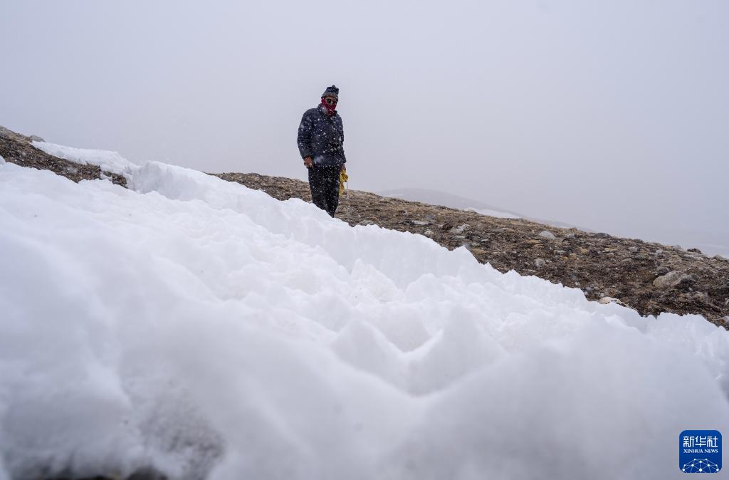 乃乃在用望遠(yuǎn)鏡查看冰川是否有異樣(5月31日攝)。新華社記者 晉美多吉 攝