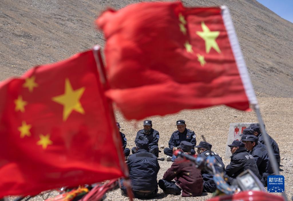 6月2日,在33號界樁處,護(hù)邊聯(lián)防隊(duì)在隊(duì)長石角(右二)的帶領(lǐng)下學(xué)習(xí)。新華社記者 晉美多吉 攝