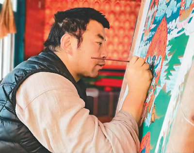 象雄唐卡畫家嘎松旺加在繪畫唐卡。據(jù)介紹,唐卡畫風的傳承最早可追溯到古象雄時期,其佛像繪制主要依據(jù)了《古象雄大藏經》中的度量法。