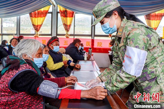 圖為醫(yī)療隊(duì)軍醫(yī)為村民測量血壓。 朱文秀 攝