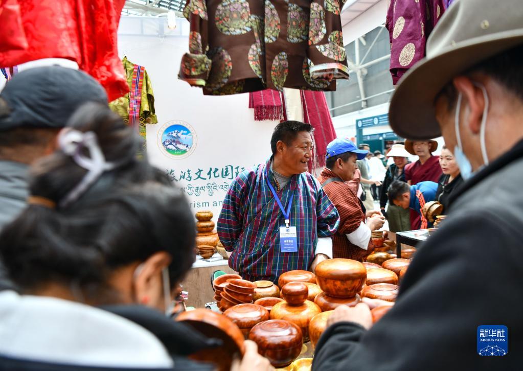 展會(huì)上的不丹商人向顧客銷售不丹服裝和木碗(6月18日攝)。新華社記者 晉美多吉 攝