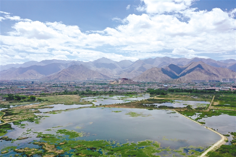 在別致的風(fēng)光中,拉魯濕地格外耀眼,呈東西帶狀的水域和蘆葦?shù)刂車弧拌偂鄙狭艘蝗G邊,與旁邊喧囂的市區(qū)形成了鮮明的對(duì)比,令人心曠神怡。
