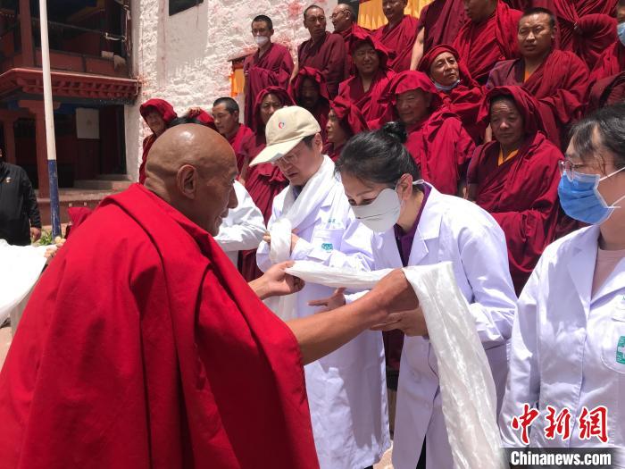 “同心·共鑄中國心”2023西藏昌都行大型醫(yī)療公益活動正在昌都舉行。當天,來自首都醫(yī)科大學附屬北京佑安醫(yī)院、北京老年醫(yī)院、北京大學首鋼醫(yī)院的醫(yī)療專家來到邊壩寺開展免費義診、愛心物資捐贈等活動。專家們抵達寺廟后,僧眾和邊壩寺管委會工作人員為他們獻上了哈達。