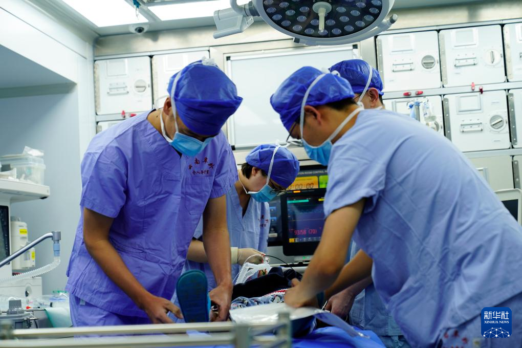 醫(yī)護(hù)人員在移動(dòng)介入治療手術(shù)車上為先心病患兒進(jìn)行微創(chuàng)手術(shù)。新華社記者 劉洪明 攝